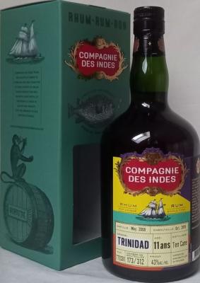 The Compagnie des Indes 2008 Ten Cane Trinidad 11-year-old Rum is an exceptional and rare offering from the now-closed Ten Cane distillery in Trinidad and Tobago. This unique rum was distilled in 2008 and bottled in 2019, with only 363 bottles ever produced, making it a true collector's item. With an ABV of 43% and presented in a 700 ml bottle, this spirit captures the essence of Trinidad's rich rum heritage. The Ten Cane distillery, established by Moët Hennessy in 2005, was renowned for its innovative approach to rum production. Although the distillery ceased operations in 2015, its legacy lives on in this exquisite rum. The name "Ten Cane" reflects the traditional method where approximately ten cane stalks are required to produce each bottle. The rum itself is a blend of 75% rum distilled from fermented cane juice and 25% traditional molasses-based rum, creating a complex and distinctive profile. On the nose, this rum offers an unusual yet captivating array of aromas, including tropical fruits like pineapple and mango, floral notes such as rose and orange peel, and a subtle saltiness with hints of spice. The palate is equally intricate, presenting bittersweet flavors of espresso, chocolate, dried fruit, and leather. The finish is dry and lingering, with notes of raisin, floral aromas, roasted almonds, and caramel, promising a sophisticated and multifaceted experience for the discerning rum aficionado.