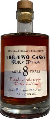 Rumclub The Two Casks Black Edition 8yo is a stellar example of fine rum production, showcasing an impressive balance of sweetness and spice. Its limited availability makes it a coveted addition to any connoisseur's collection, promising a rich and layered tasting experience that lingers beautifully on the palate.