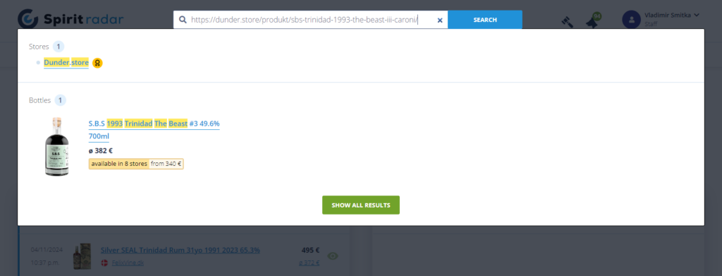 But my favorite recent little feature is the bottle search by URL. If I'm browsing an ecommerce site, I just copy the address of the offer into the search and Spirit Radar immediately shows me that bottle with all the competing offers and current value. It's very handy for price checking.