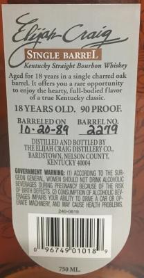 Application has the following data for Elijah Craig 1989 Single Barrel New Charred Oak 2279 45% 750ml: