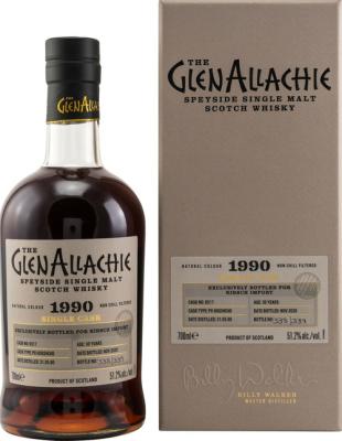Since mid-2020, the design of GlenAllachie's Single Casks has been elegantly refined, giving more space to the excellent contents of the beautifully shaped bottles and boxes with a fine texture. This is especially true for the five new single malts, all limited and exclusive to the German market and customers of Kirsch Import. These bottlings symbolize the complex and fruity spectrum for which GlenAllachie is renowned. The Glenallachie 1990 PX Hogshead #6517 Kirsch Import is a testament to this, aged in PX Sherry Casks for up to 30 years. Distilled in 1990 and bottled in 2020, these cask-strength single malts have developed an intensely dark mahogany hue. This rich color hints at the flavors within: a wealth of dark chocolate, dried fruits, and mocha with sparkling notes of citrus fruits and cinnamon. Only 339 bottles of this exquisite whisky have been produced, each with an ABV of 51.2% and contained in a 700ml bottle. This exceptional spirit is a product of the Glenallachie Distillery, a renowned establishment in the Speyside region.
