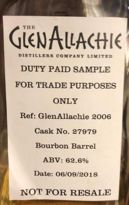 Application has the following data for Glenallachie 2006 Duty Paid Sample For Trade Purposes Only Bourbon Barrel 27979 62.6% 200ml:
