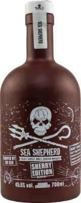 This whisky is part of the first batch of single malt whisky from an Islay distillery, matured in Sherry casks for 12 months, and supports the Sea Shepherd organization dedicated to marine conservation.