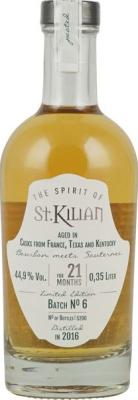 Unveiling the "St. Kilian 2016 The Spirit of St. Kilian Batch #6," a gem from the renowned St. Kilian Distillers. This 350ml whisky, bottled in 2018, is a celebration of German craftsmanship. Limited to only 5200 bottles, the 44.9% ABV spirit offers a unique sensory journey. Batch #6 is a masterful blend of distinct peat notes with an enticing vanilla sweetness and spicy aromas of roasted nuts. These complex flavors are achieved through 21 months of aging in Ex-Bourbon and Ex-Sauternes white wine casks. The foundation of this batch is the award-winning Turf DOG, resulting in a smoky yet fruity-fresh new make.
