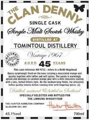 Application has the following data for Tomintoul 1967 HH The Clan Denny Refill Hogshead HH 9711 The Limburg Whisky Fair 45.1% 700ml: